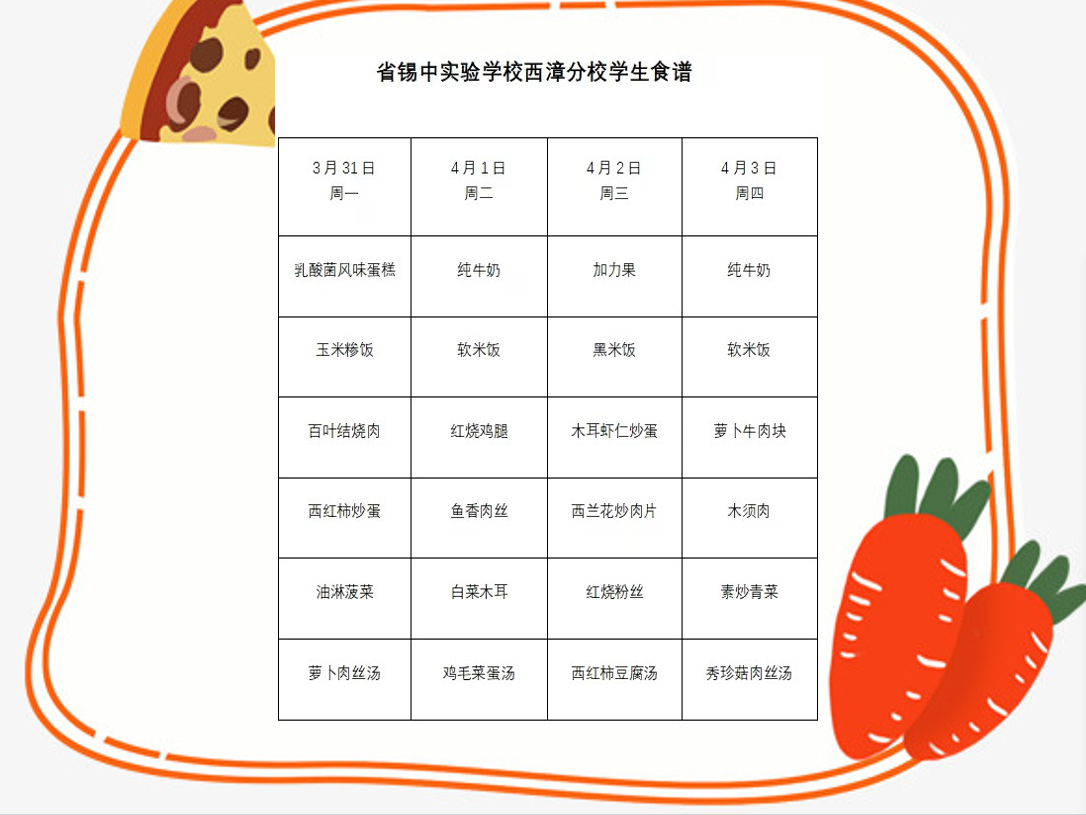 省锡实西漳分校每周学生菜单(3月31日——4月3日)