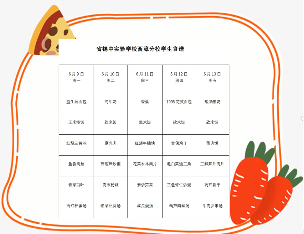 省锡实西漳分校每周学生菜单(6月9日——6月13日)