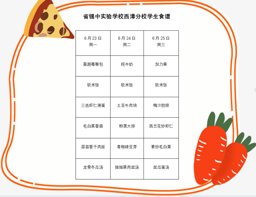 省锡实西漳分校每周学生菜单(6月23日——6月25日)